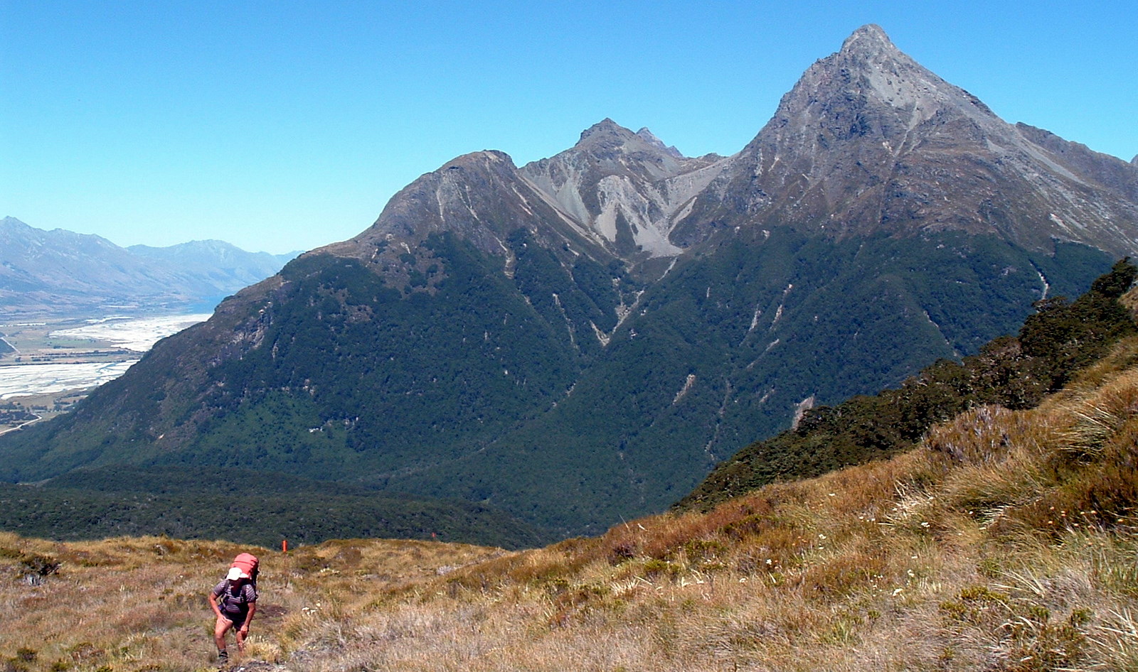 When we cleared the scrubby bush margins into open country, the view was stunning. Looking back towards Glenorchy and Lake Wakatipu, the sky was deep blue and the sheer scale of the vista totally breathtaking. Taking it all in, we all silently acknowledged that this was why we came, and why we will keep putting heavy backpacks on for years to come.