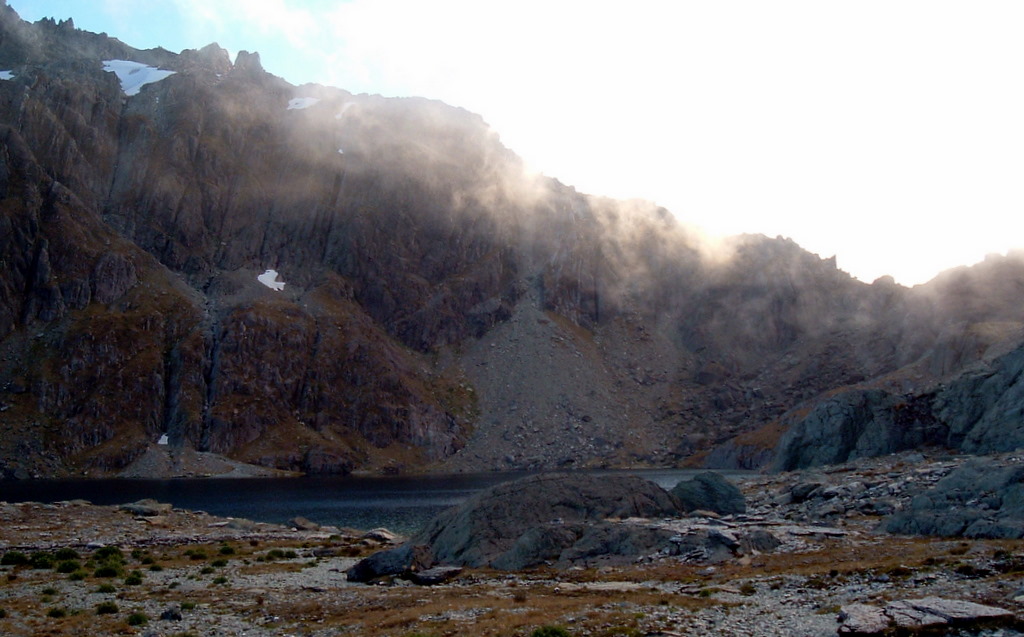 There is really only one place to camp at the lake – a small area of smooth ground with a low rock wall built around it to shelter tents from the prevailing wind. We setup camp in that spot and got busy cooking some food. Being at 1500 metres, the air temperature at the lake drops dramatically as the sun gets low. This effect is exaggerated by the high crags to the West which cut out the late afternoon sunshine. It wasn’t long before we had all pulled on a few extra layers of warm clothes.