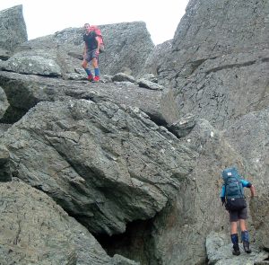 Traversing a sharp rocky ridge we steadily gained altitude. It took a little longer than we expected, but we did eventually crest a rise and found ourselves looking down at a the first of two large mountain tarns. Being a bunch of boys, we naturally took our packs off and began skimming stones across the glassy surface. I’m sure my mother would have told me to stop it, immediately! “If everyone does that, there will be no tarn one day.” But we did it anyway – some of us maybe a little guiltily…