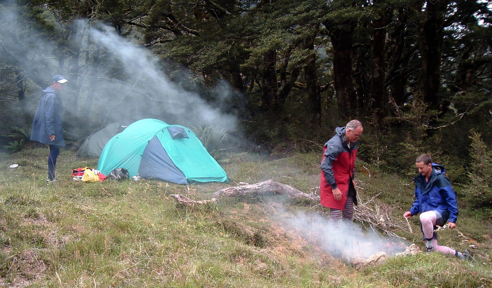Finding a good spot for our tents proved a little bit of a challenge. The open expanses of the valley were mostly boggy and uneven. Ahead in the middle of the grassy flats we spied what appeared to be an “island” of Manuka trees and bush which looked promising. It was clear we weren’t the first to think along those lines. On the river side of the elevated bush covered island was a clear grassy flat which had obviously been used as a campsite many times before. We dumped our packs and put the tents up.