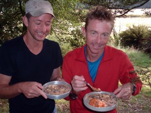 We heated them together in a large billy, with Magnus standing to one side looking extremely skeptical. And justifiably so. Things turned rather pear shaped. The freeze dried food didn’t get enough time to rehydrate properly. Mixing them together created an unholy looking bucket of slops. It tasted extremely bland. To cap it off, the beans remained firm on the outside, and dry and powdery inside. Like little dust bombs. We had somehow managed to followup one of the most triumphant tramping meals ever with possibly the most disastrous ever. It was hard to eat not only because it was so terrible, but also because we were all laughing so much.
