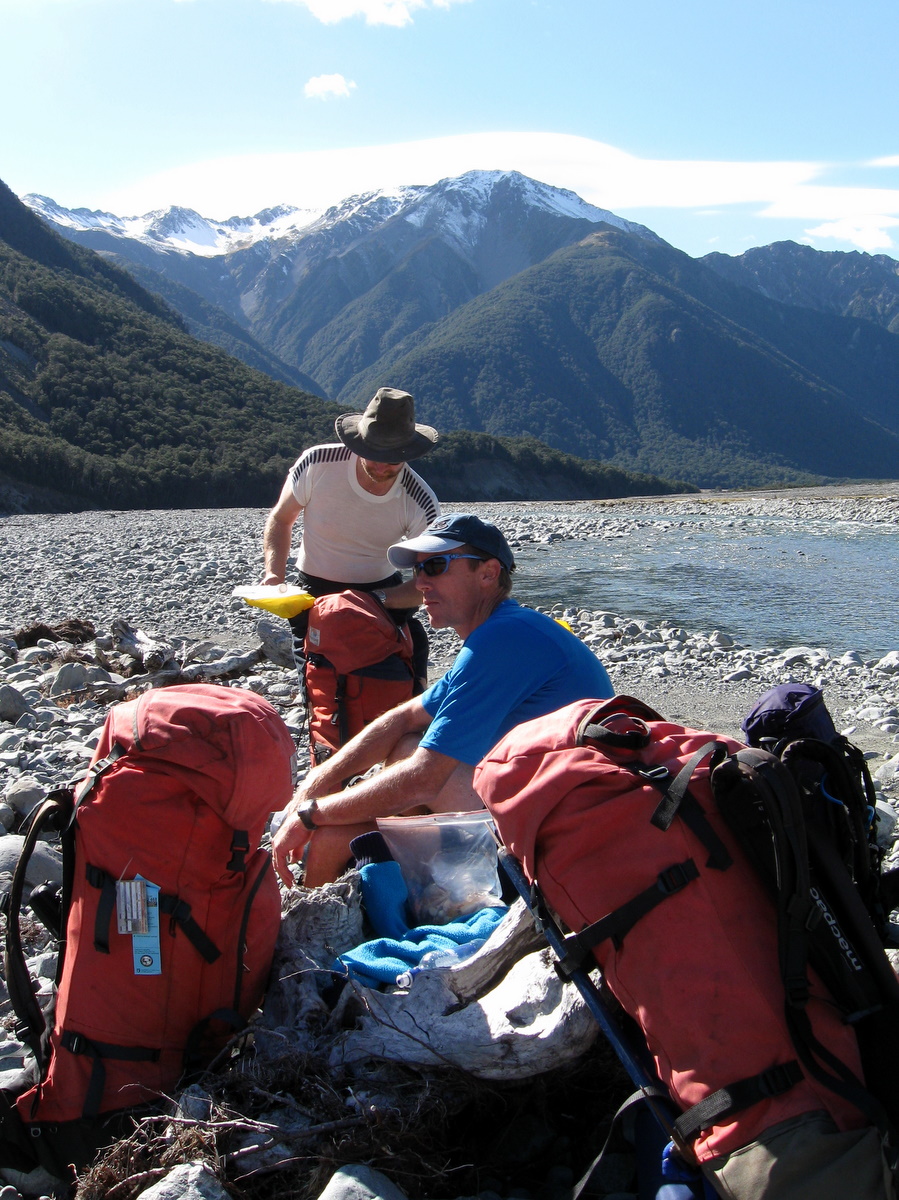 After lunch we braved the sandflies on the deck and pulled on our wet socks and boots.  Food and anything else thrown out of packs were systematically stuffed back in.  “Bugger, what the hell have I done with my glasses,” muttered Adam, rifling through some bags.  Paul, with a smirk on his face, replied “…your glasses?”  At which point Adam realised he was in fact wearing them.  A sure sign he has joined the over 40′ (12.2 m)s club in body and in mind!