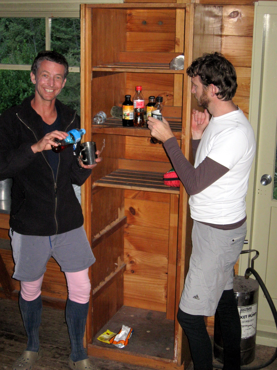 Once in the riverbed again we covered ground quickly, and by late afternoon the Moa Hunters were pulling off their boots at the Carrington Hut.  A group of three others had claimed the coveted left-wing of the hut which has a log burner fire in it.  We didn’t mind.  Our side felt cosy enough once we filled it with the smells of cooking and had another of Magnus’s delicious whisky infused hot chocolate drinks in our bellies.