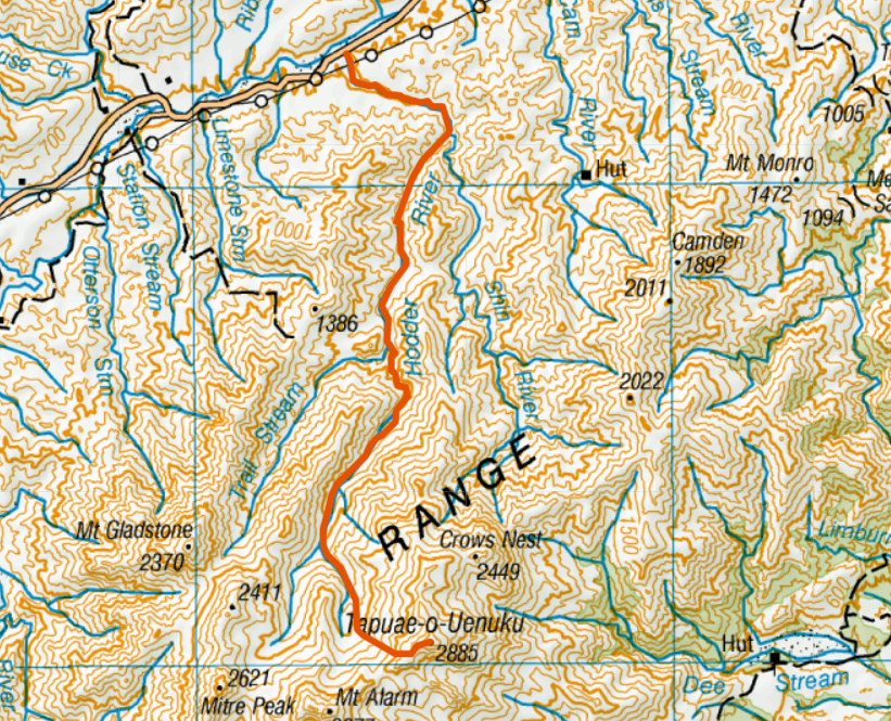 “We approached Mt Tapi up the Hodder river. I seem to recall you drop to the river above the Hodder huts, cross and head straight up the guts near a stream. Bear right to avoid some rocky bluffs, then left above the bluffs you re-meet the small stream that comes out of the mountain. This is the last fill of the water bottles. It’s then a steady climb until you find yourself on a rocky ridge that forces you left (very good views to the coast between rocks in ridge).