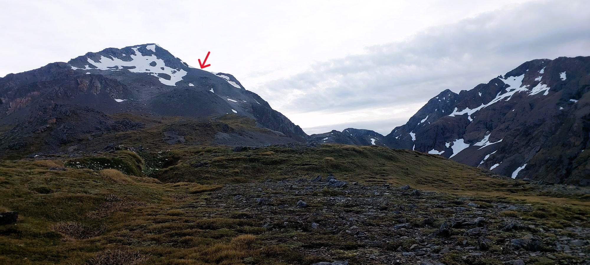 The climb is about 400m from Lake Browning, and if you have had a good sleep and breakfast, it can be completed without undue huffing and puffing. We found a satisfying large cairn just before the highest point of the route, confirming we were on track and removing any doubts we might have had regarding our navigational skills.