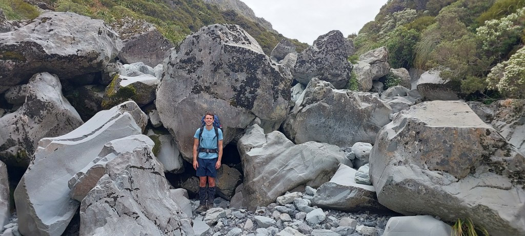 Luke at 190cm very tall, made relatively speedy work of the river-bed boulder hopping and progress was quick until Julia creek permanently re-emerged from the rocks and the surrounding scrub thickened and closed into the banks of the creek. It is at this point you need to keep an eye out on the true right for the marker that indicates the start of the old track to the Julia Hut.
