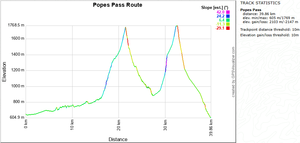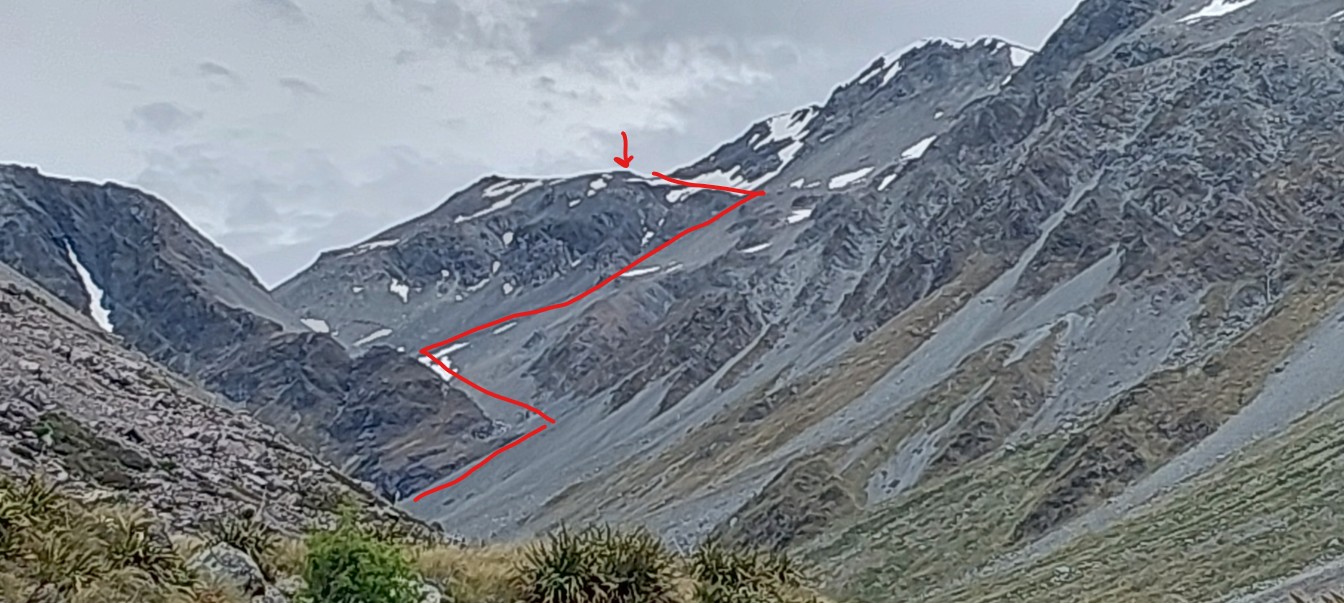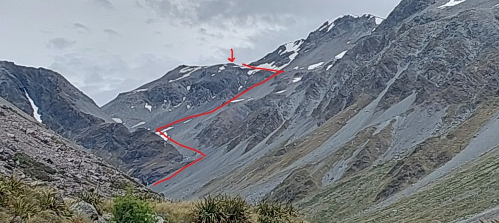 The route takes you approximately 200m above and 500m to the West of Pope’s Pass, as the pass itself is surrounded by steep loose bluffs and cliffs. From Lake Browning travel North-East up the obvious shoulder that leads in the direction of Pope’s Pass and Mt Harman.