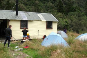Because the huts are an easy day walk with the added attraction of hot pools, they are a popular destination for weekend walkers. And we were there on the weekend. Consequently sleeping spots were at a premium, with both huts quickly filled to capacity and an array of tents dotted about outside.