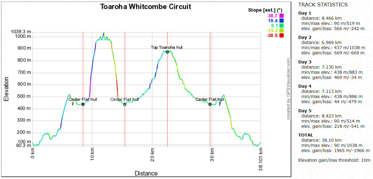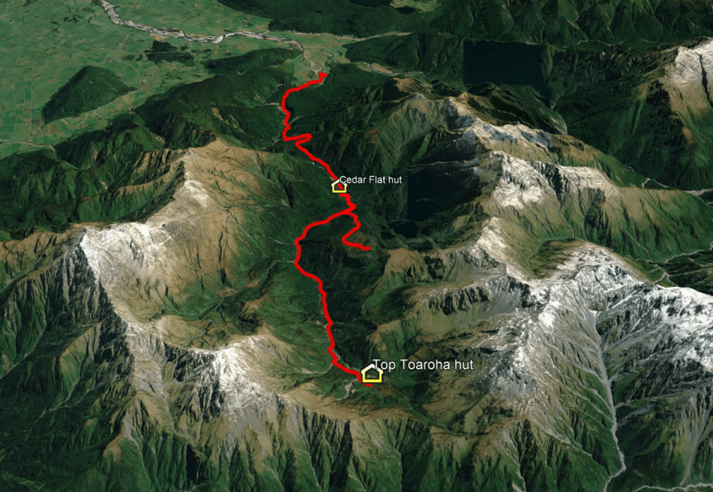 Day 1: Toaroha Road End to Cedar Flat Hut and Wren Creek hot pools. Day 2: Cedar Flat hut to Yeats ridge and back to Cedar Flat hut. Day 3: Cedar Flat to Top Toaroha hut. Day 4: Top Toaroha hut to Cedar Flat hut. Day 5: Cedar Flat hut to road end.