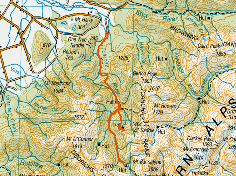 Originally we planned to do the Rabbit Pass trip this year, but Mother Nature had other ideas. A very large landslide dammed the North branch of the Young River and created a substantial lake above it. The Department of Conservation, unsure of the stability of the dam, closed the Young Valley track, effectively buggering our prospects of doing the Young Valley, Gillespie Pass, Rabbit Pass walk. Undaunted we came up with this itinerary instead:
