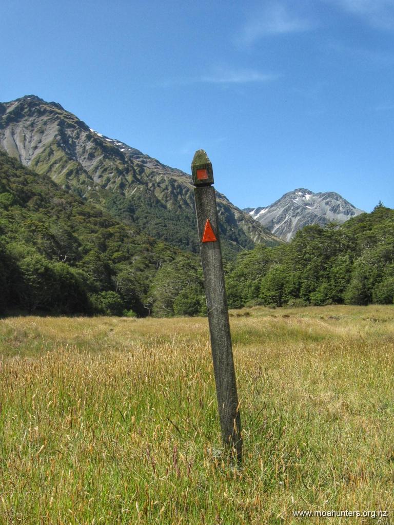 Beyond the boulder slide, a poled route leads down easy grassed slopes onto what becomes a prominent ridge that heads leads into the bush. It was around 11:30am when we entered the beech forest once again, knowing we still had a very long descent ahead of us.