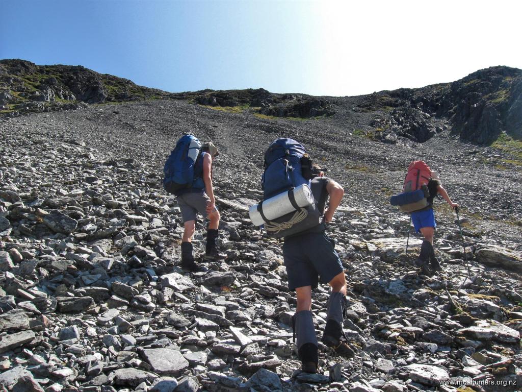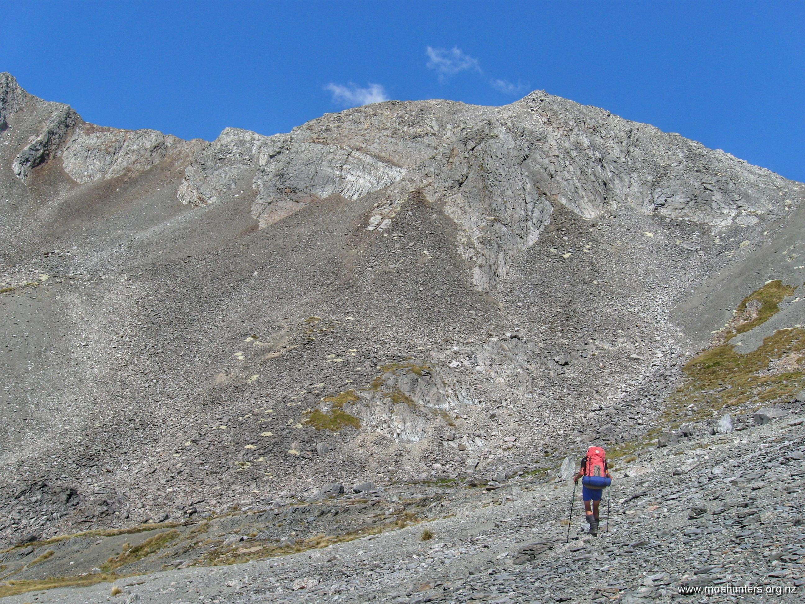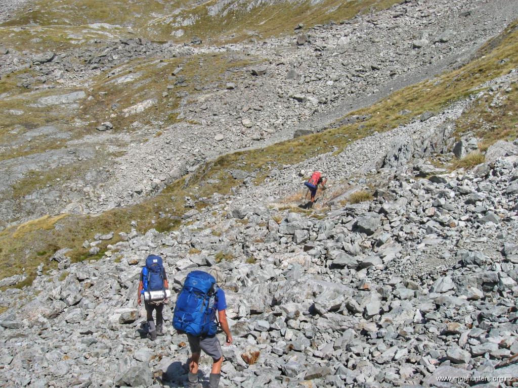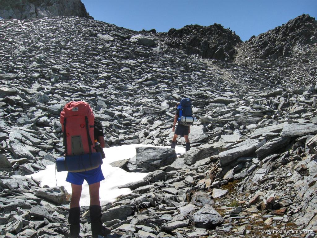 An hour into the climb there are some nice spots to take a break. We dropped our packs at one of these pleasant flats and spent some time checking out the view below and the route above. We could now see rocky Moss Pass awaiting us at the top of a steep shingle strewn climb.