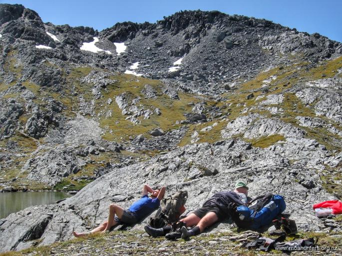 There was no massive panorama to enjoy from the saddle, but it was still a lovely spot to have a nibble of scroggin and take a drink of cool tarn water. Paul and Luke scampered up the rocky knob to the right of the saddle for a higher vantage point.