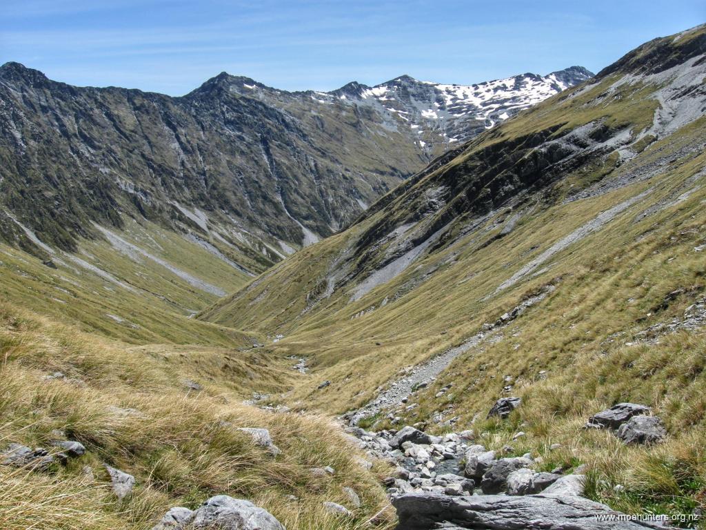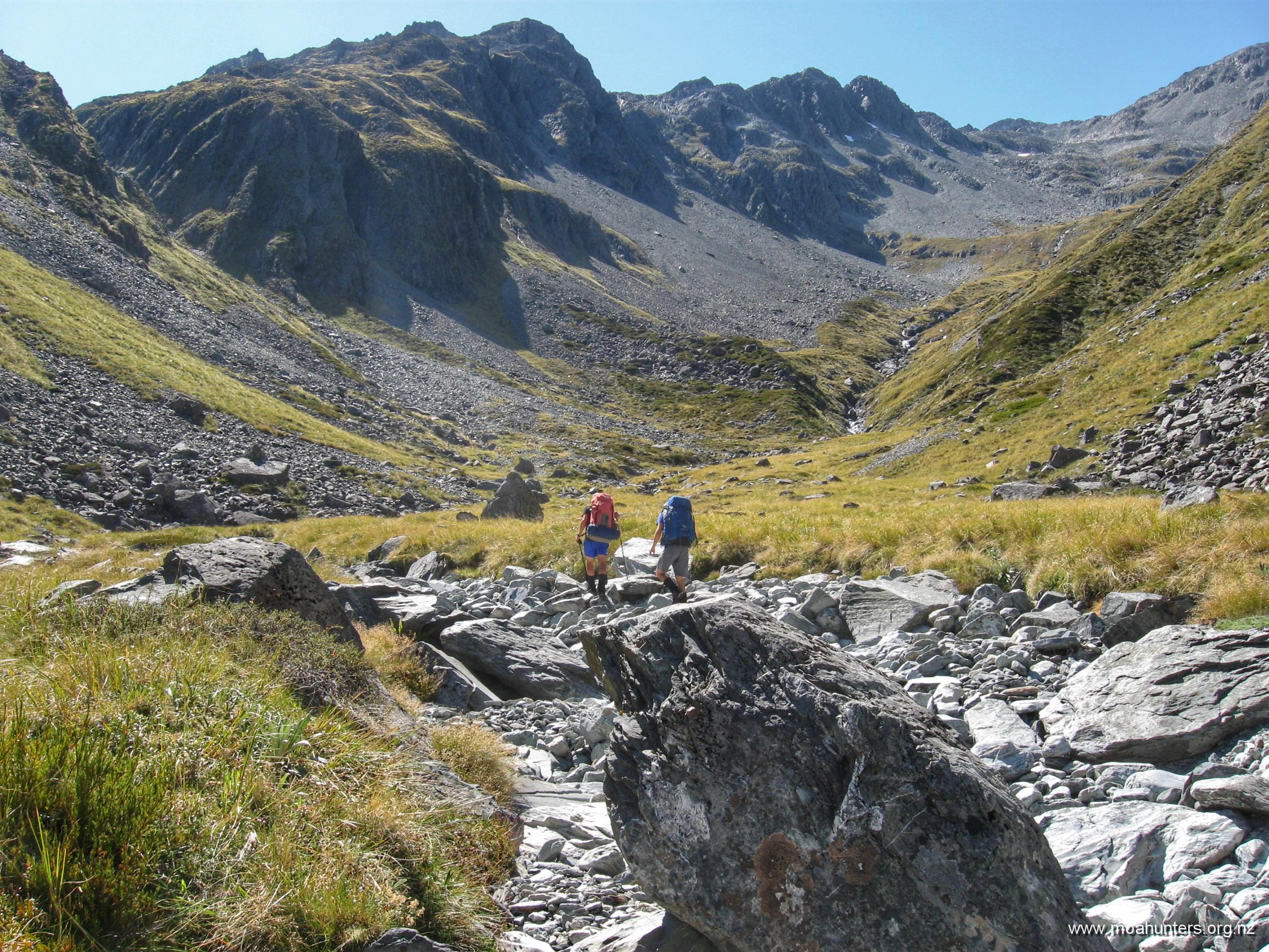 Fuelled by chocolatey goodness, we dropped off the pass making our way through similar terrain encountered on our ascent – rocks and rubble. However, this soon gave way to flatter country with patches of grassy tussock.