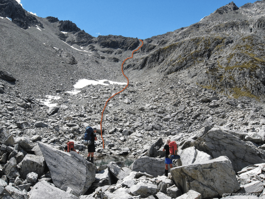 The rock chute is the highlight of the climb to Moss pass, but it is not the finale. Emerging through a narrow gap the chute leads to a comparatively flat rocky basin. Beyond that is a 10 minute grunt up a moderately steep rock-strewn face to the pass.