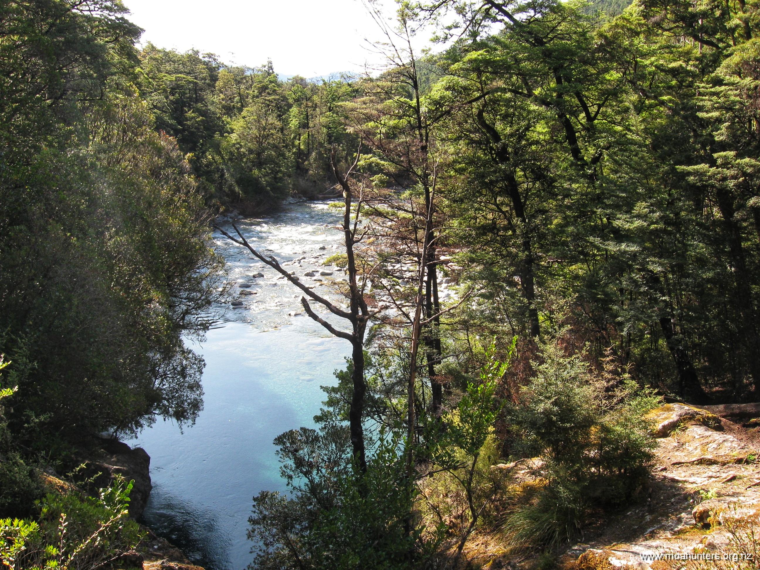 Once off the steep section, the track slides round to the north through gorgeous mossy forest. We enjoyed the easier walking and lovely surroundings, arriving at the bridge over the D’Urville river at 3:30pm – bang on two hours from when we left the lunchtime tarn stop.