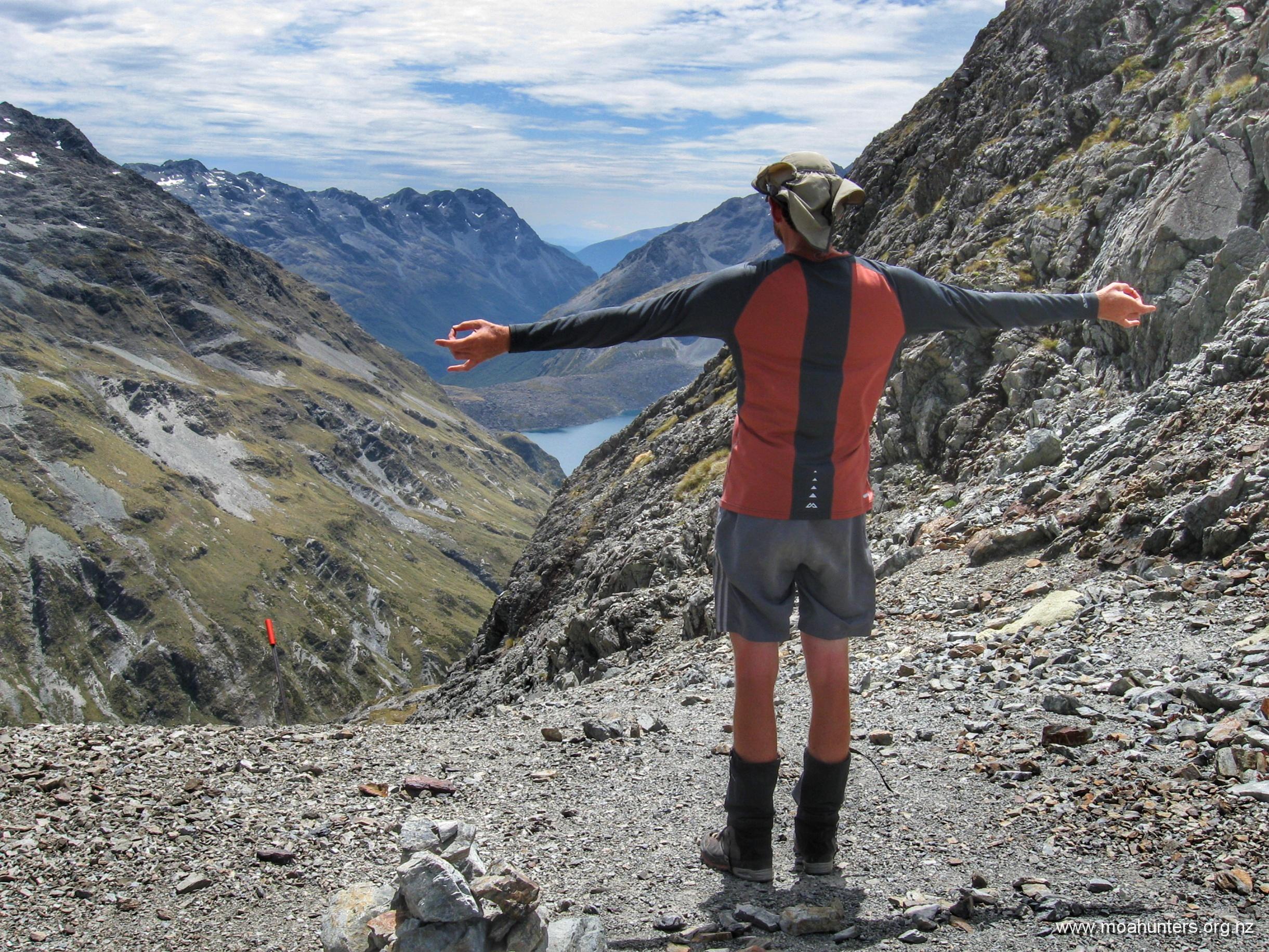 There was no massive panorama to enjoy from the saddle, but it was still a lovely spot to have a nibble of scroggin and take a drink of cool tarn water. Paul and Luke scampered up the rocky knob to the right of the saddle for a higher vantage point.